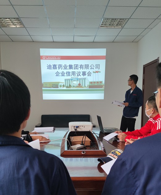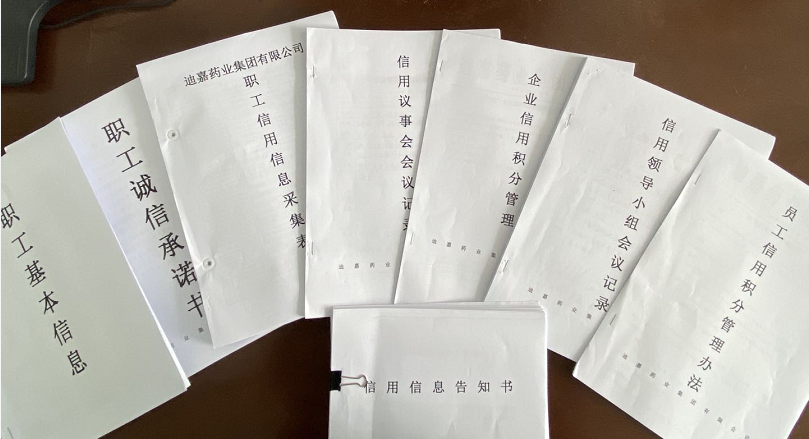 “人无信不立、企无信不兴”。为了更好的推动企业信用建设,在山东省威海市文登区工信局、文登经济开发区管委指导下,迪嘉药业集团有限公司建立了信用领导小组、信用议事会等领导机构,配备了信息采集员、监督员等专责人员,定期组织会议研究布置信用建设工作,对职工守信失信行为进行及时的收集,并依规给予职工信用积分的奖扣,企业形成了积极向上、争当信用模范的新气象。