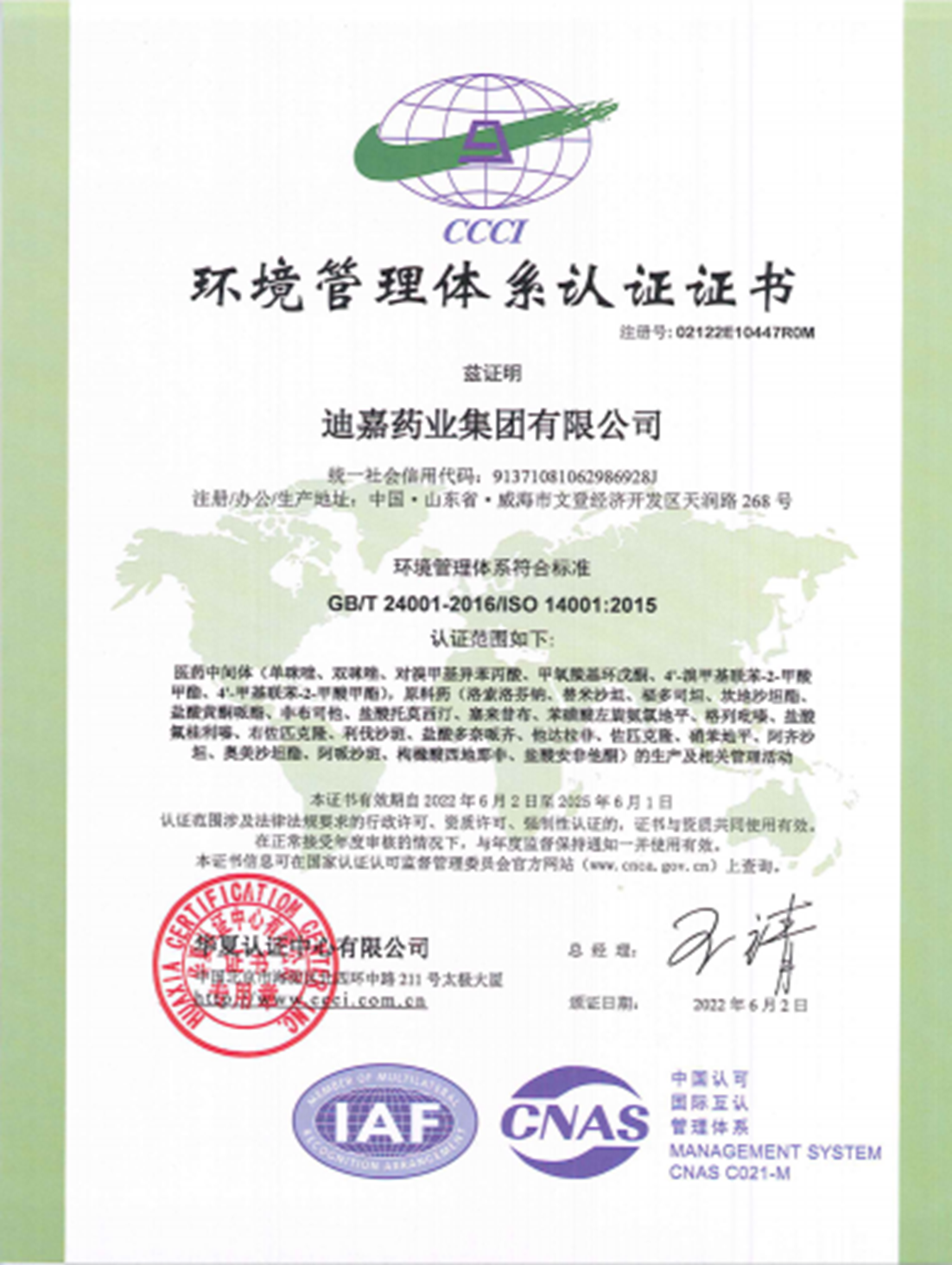 5月17日-19日,迪嘉集团迎接了环境管理体系认证专家5人组的二阶段审核。审核组对公司环保设施的建立、运行以及现场的环保管理,给与了一致好评,并顺利通过了体系二阶段审核,于6月2日颁发认证证书。